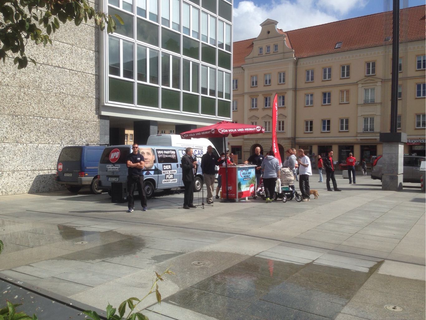 Heute um die Mittagszeit stand die NPD mit Udo Pastörs und dem Bundesvorsitzenden Frank Franz auf dem Neubrandenburger Marktplatz. Mit den rund 20 Personen, die teils aggressiv die Stand verteidigten ging es anschließend auf den Datzeberg. Besonders toll dürfte der Besuch für die NPD jedoch nicht gewesen sein. U.a. reagierte die Jugend vom B.U.N.D. prompt und störte den ruhigen Ablauf.